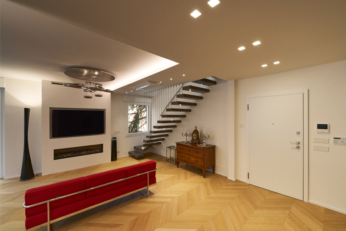 In particolare tre ambienti (ingresso, salotto, sala da pranzo) sono stati riuniti in un unico open space, che raccoglie le tre funzioni e che si apre sull'angolo cucina. La realizzazione di un ampio controsoffitto (resosi necessario per nascondere gli interventi antisismici), ha permesso di ri-equilibrare i mutati volumi dell'ambiente. La cornice di luce radente, attraverso una discreta illuminazione delle pareti, alleggerisce visivamente il grande controsoffitto, e fornisce luce di base all'ambiente dall'alto verso il basso. Coppie di faretti integrano e garantiscono luce d'accento dove serve. L'illuminazione indiretta sopra i pensili della cucina invece, ribalta la percezione del piccolo ambiente laterale, ampliandone i volumi.